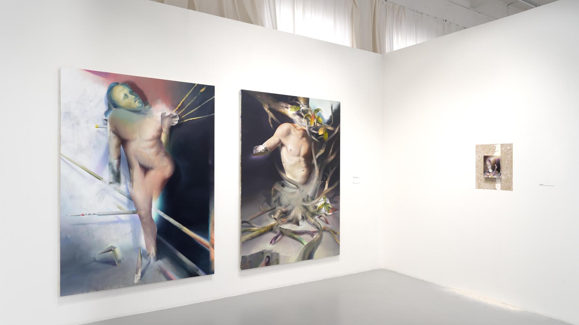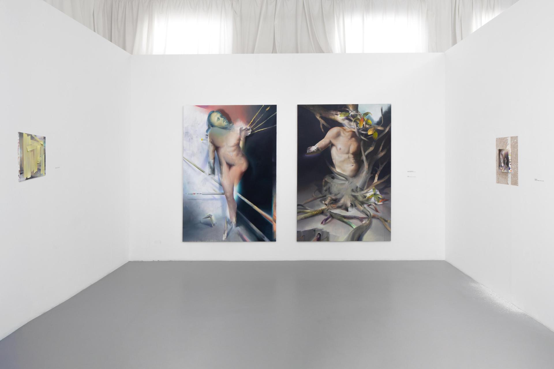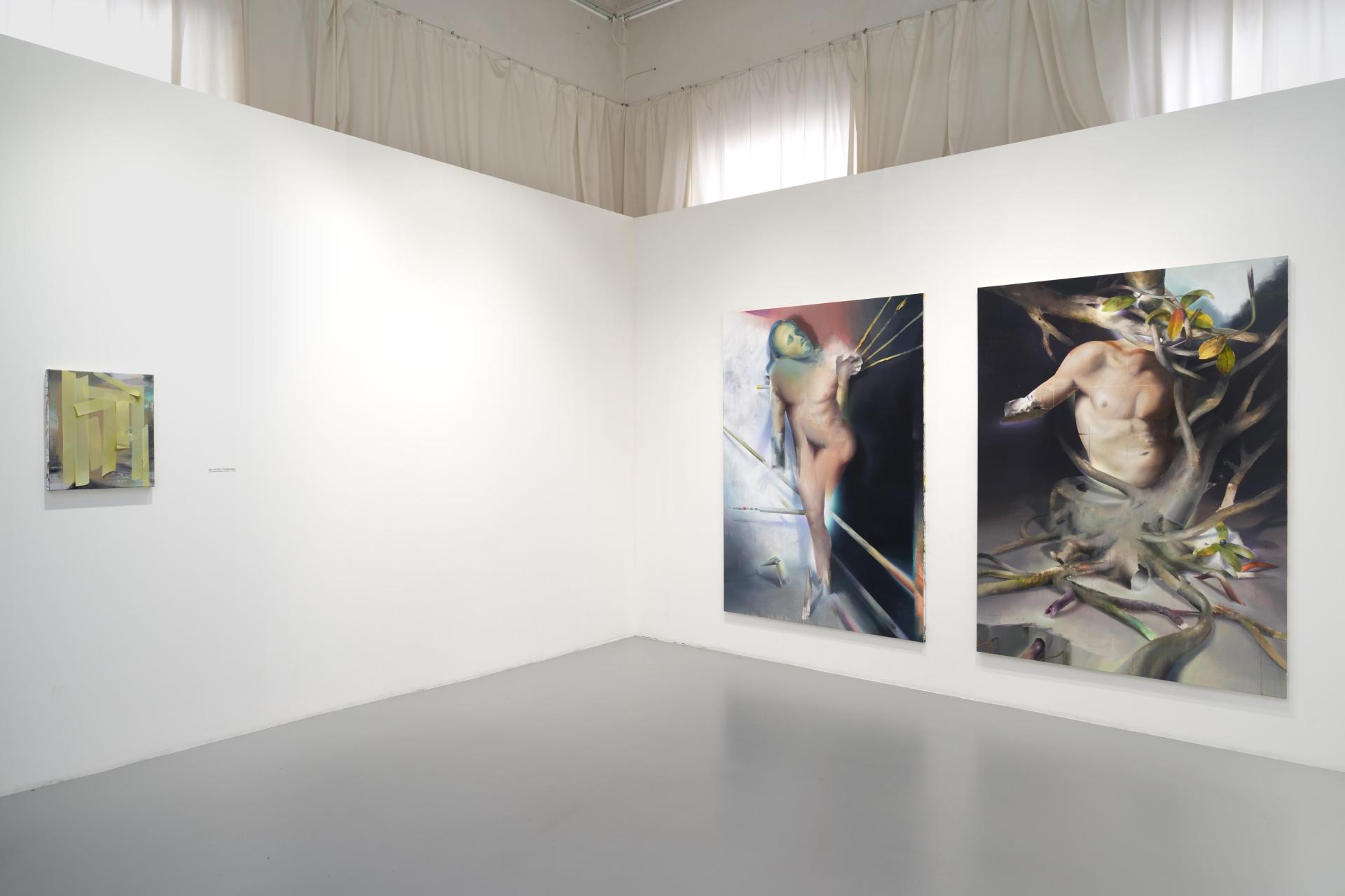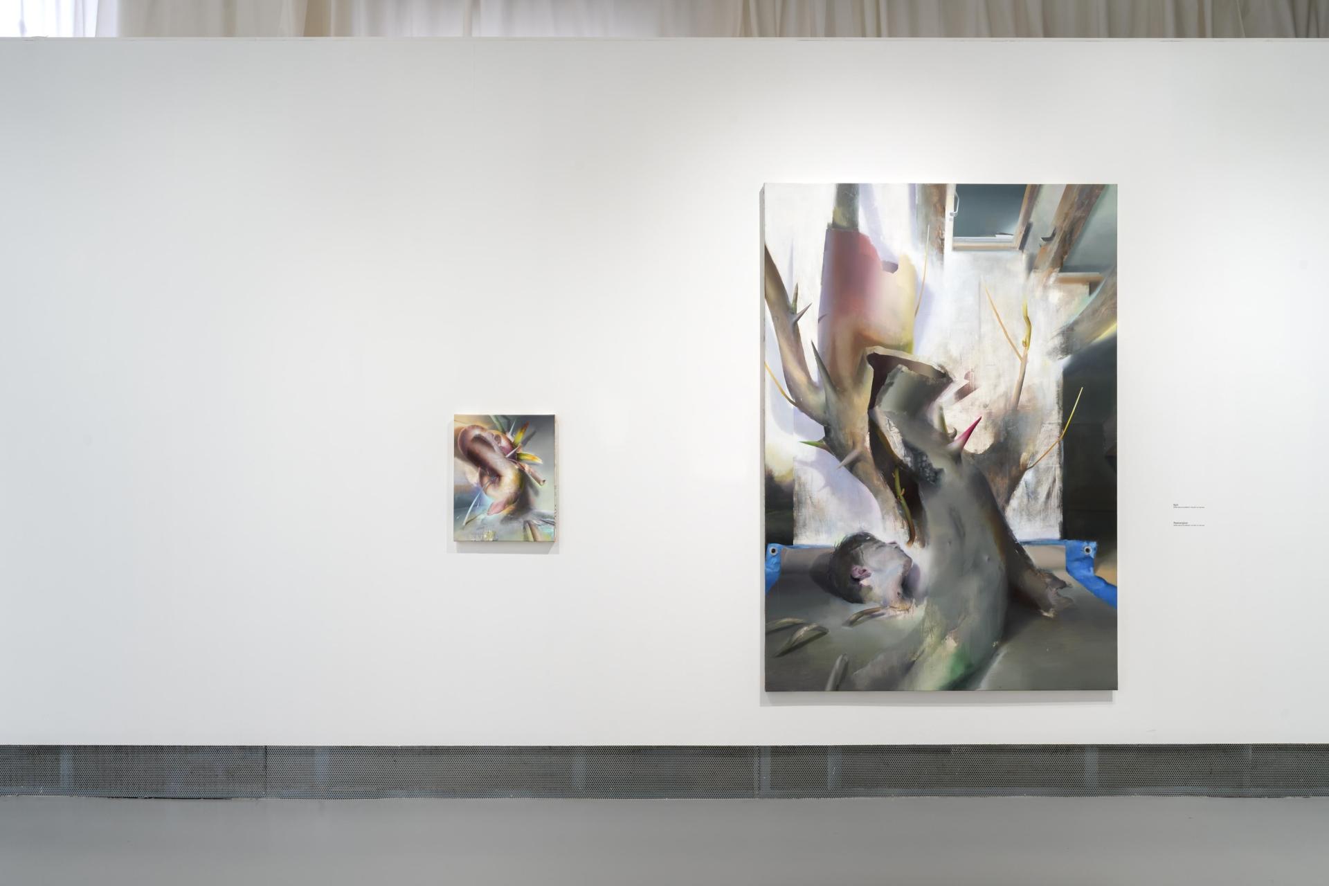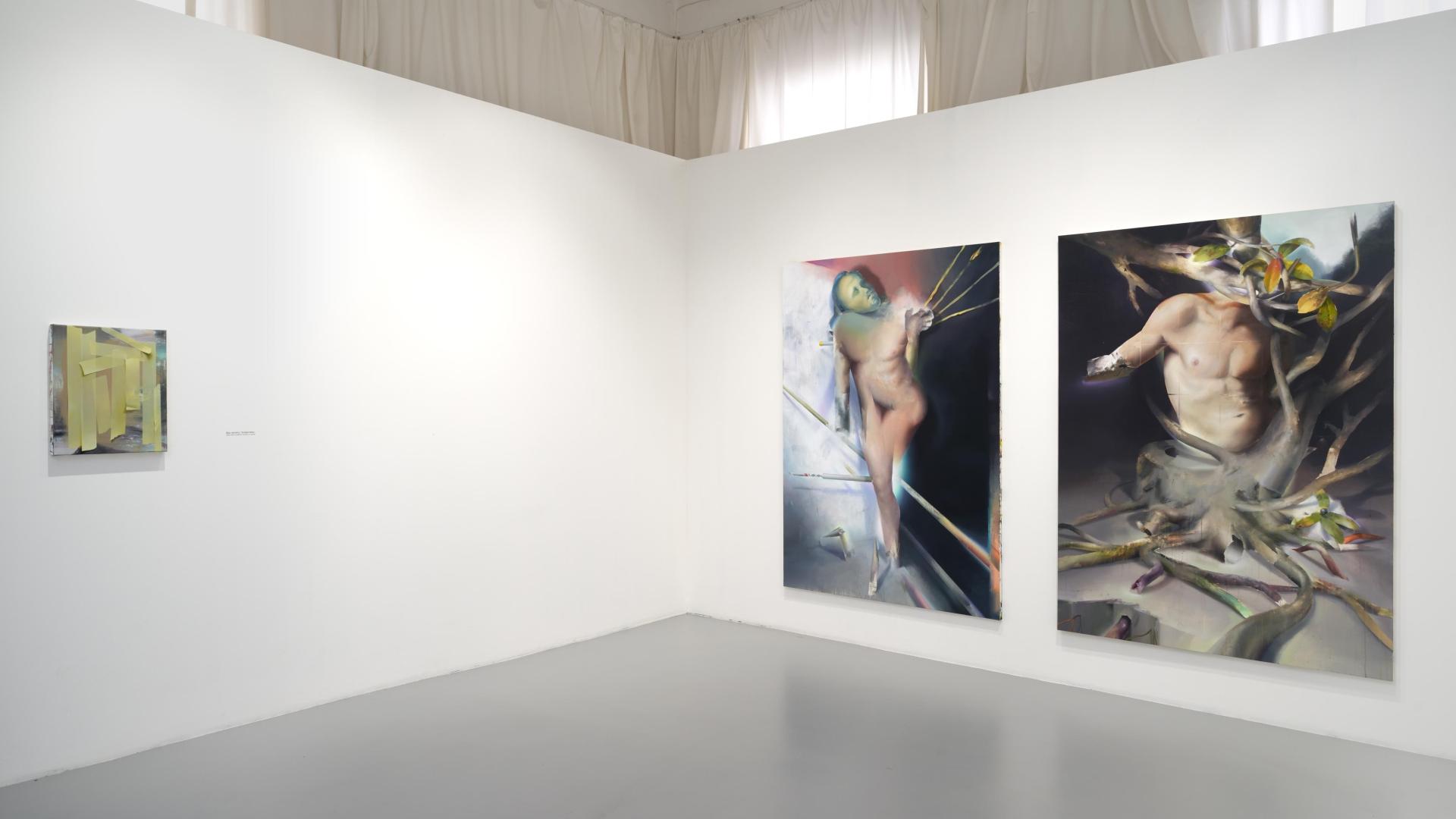 Marek’s approach to painting seems similar in principle. His paintings do not seek original sources, but rather structures of meaning. They tell us, in the manner of Crimp, that beneath every image there is always already another image. In the short post-Covid period, when the artist immersed himself most deeply in exploring the social memory of humanity and deposited individual synapses on canvas as if on a photosensitive plate, it seemed as if his almost surgically precise technique would be helpful in this endeavour. In time, however, he realised the limits of this modus operandi and turned to a technique that suppresses techné, while in return being in closer symbiosis with the central message of the images, rendering it easier to express the volatile essence of memory, its inherent unreliability, brevity and fragmentary nature. In other words, this technique allows him to transform his own canvas into a palimpsest. Marek mastered the process of layering and subsequent washing out while still at school, and his inner doubts often obliged him to return to specific works, piling up pentimenti, making changes and corrections. From a certain moment onwards, however, he no longer felt the need to erase these traces. Disconnected fields – sometimes illusory paintings with elements of trompe-l’oeil, sometimes textures accentuating materiality – became not only an ideal medium for associative motifs, but also an eloquent metaphor for his thinking via the image.